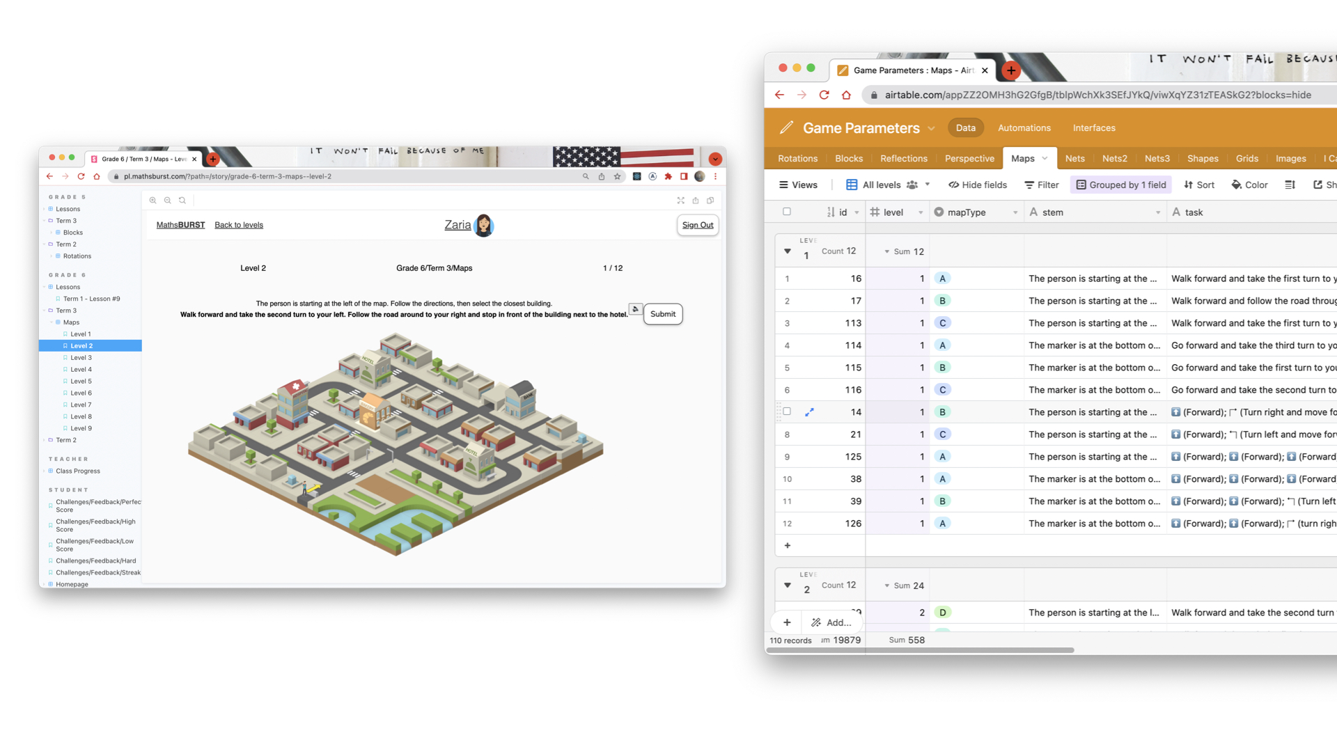 I was able to draw on my experience as a game designer on Active Memory, to make sure our workflow was favorable to rapid iteration. Quickly prototyping the challenge using JavaScript React components would allow us to test many UIs quickly. I used Airtable and Storybook to allow the team to preview the work in progress, and tweak the parameters of the game. We'd then refine the game based on feedback from teachers and students. Rapidly building a game this way was very quick, as we could reuse components between games.