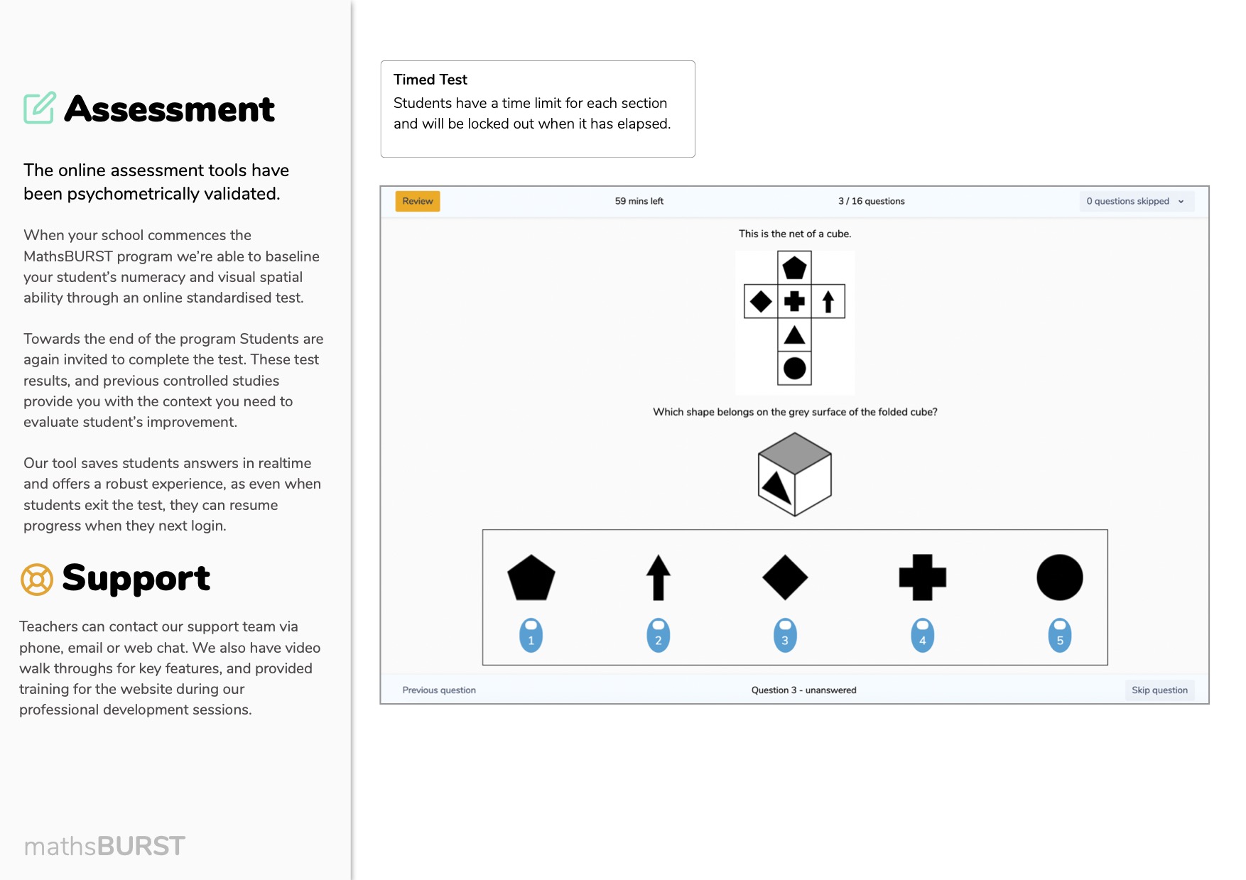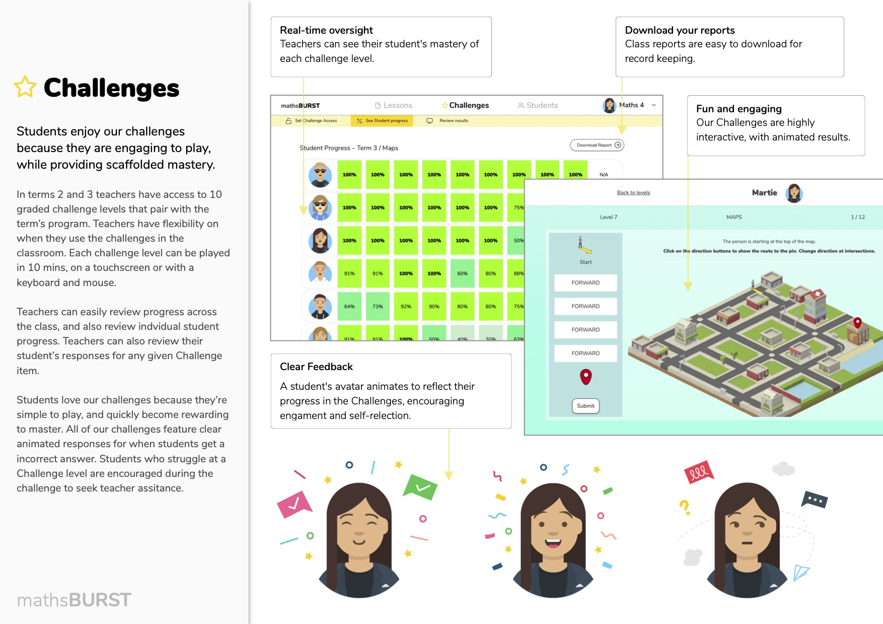MathsBURST was built to be fully integrated platform, with all the components easily accessible to teachers and students through a single account and web app. This included, lesson plans and professional development material. Student's dashboard and access to Challenges. Assessment tool for measuring progress of the students at the start of the cohort and at the end. Plus of course support resources for teachers and schools.