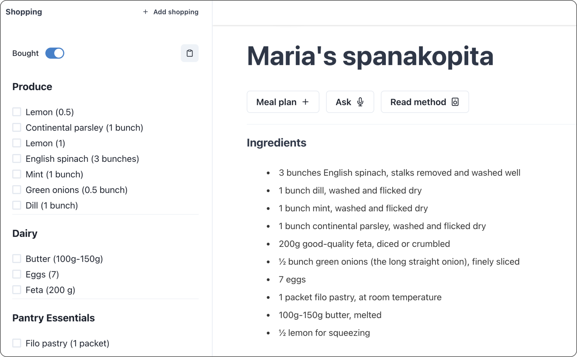 Letās turn this recipe into an actionable plan for our chef. Weāre going to update our shopping list and also create a run sheet, which is a version of the recipe optimized for the kitchen bench.
